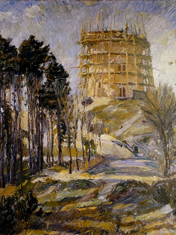 Mit kräftigem Farbauftrag und deutlich sichtbaren Pinselspuren hat Beckmann den Wasserturm im Berliner Stadtteil Hermsdorf festgehalten, wo er von 1907 bis 1910 lebte. Die hellen Farben und der lockere Pinselstrich spiegeln sein Interesse an der impressionistischen Malweise wider. Der im Bau befindliche Turm erhebt sich auf einer Anhöhe neben einem Kiefernwald. Die Streben des Baugerüsts und die schlanken Bäume erzeugen eine aufwärtsgerichtete Dynamik, die das Motiv an den „Turmbau zu Babel“ erinnert – passend, da Beckmann sich in dieser Zeit häufig mit biblischen Themen auseinandersetzte.